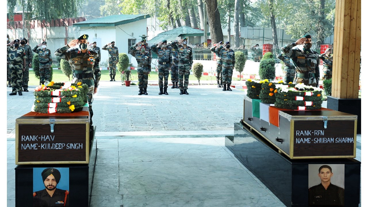 Army today, paid a befitting tribute to Late Havildar Kuldeep Singh and Late Rifleman Shubam Sharma, who made the supreme sacrifice on 01 Oct 2020 in North Kashmir. In a solemn ceremony at BB Cantt, Lt Gen BS Raju, Chinar Corps Commander and all ranks paid homage to the bravehearts on behalf of the proud nation.