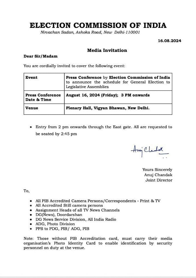 New Delhi [India], August 16 : The Election Commission of India (ECI) will announce the schedule for assembly elections on Friday at around 3 pm.