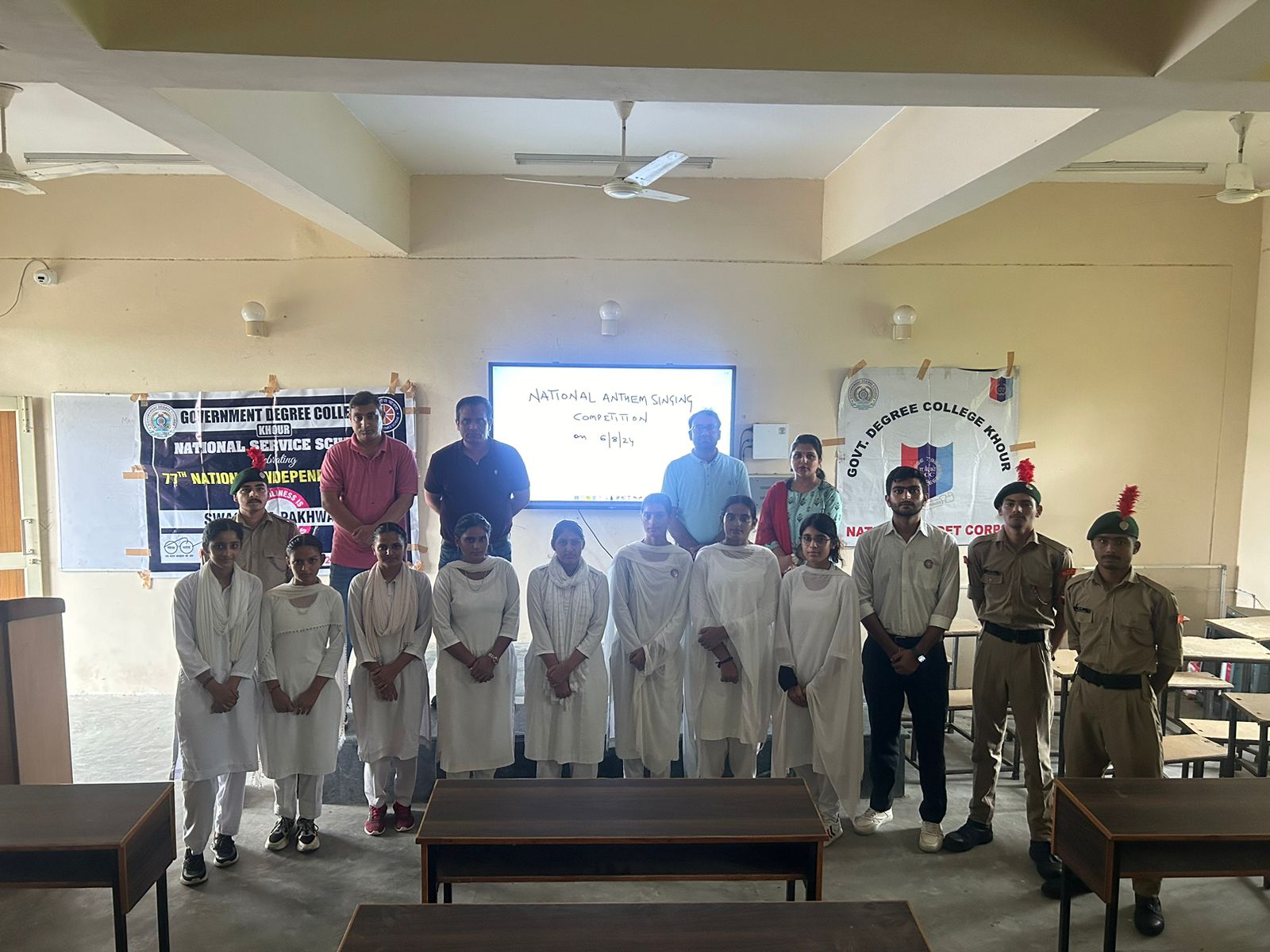Khour (Jammu), August 6 : As part of series of activities to commemorate 77 th National Independence Day under the banner of ‘Swachhta Pakhwada”, Govt. Degree College Khour organized National Anthem Singing Competition. Eight students from NSS & NCC units of the College participated in the competition with the aim to showcase patriotism. In this competition four different teams with two participants in each team gave tough battle to each other. Dr. Chetan Sharma, HoD Physics & Mr. Sunil Kumar, PTI acted as members of Jury and evaluated the participants skillfully. In this competition team of Tania Sharma & Janvi Manhas secured first position while team of Simran Sharma & Mansi Sharma bagged second position whereas team of Diljit Singh & Sumit Sharma secured third position. In his brief address, Principal Prof. (Dr.) T.K Sharma expressed his delight for participation of students in this activity related to Swachhta Pakhwada and encouraged them to ignite the sense of Nationalism in themselves from the stories of freedom struggle and contribution given by National heroes in attaining Independence. The event concluded on a high note, with participants expressing their gratitude for the opportunity to showcase their skills. The whole event was coordinated by Prof. Himanshu Khajuria, NSS PO & Prof. Shivani Sharma, NCC ANO.