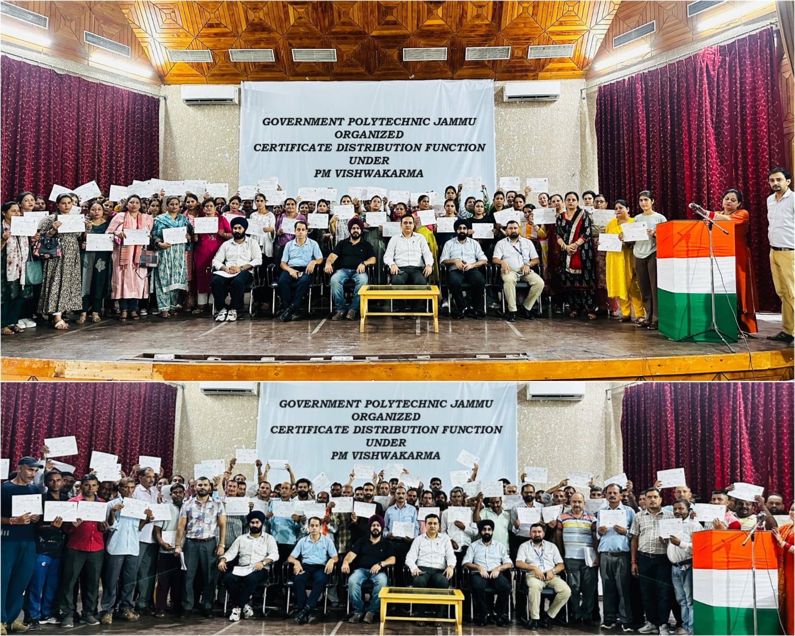 Jammu, 30 July : Government Polytechnic Bikram Chowk Jammu today organised Certificate Distribution Function under PM Vishwakarma Scheme in which certificates were distributed to 248 trainees in Fifteen Batches of Assistant Barber-Salon Services, Carpenter(Suthar), Blacksmith(Lohar), Brick Masson-Basic(Rajmistri) Trade/Job Role, on the successful completion of the Basic Skilling Training under PM Vishwakarma Scheme.