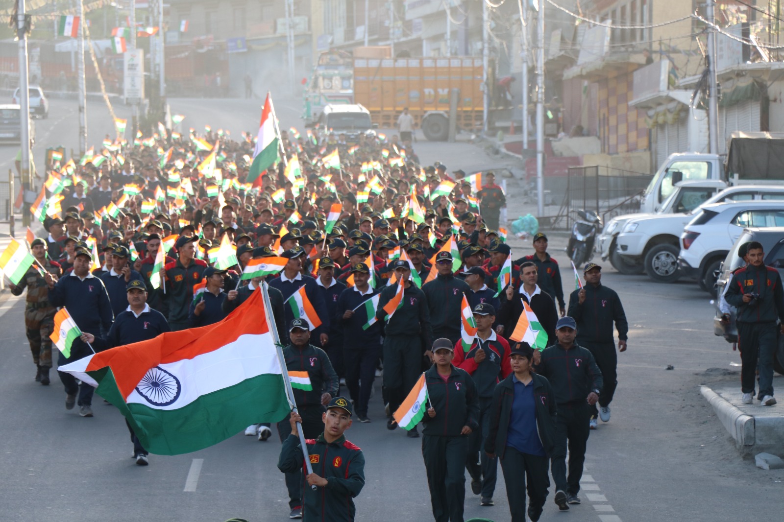 Leh, August 14 : Celebrating the spirit of Har Ghar Tiranga campaign, a Tiranga Pride March was organised by the Ladakh Scouts Regimental Centre under the aegis of Fire and Fury Corps at Leh today. The Tiranga pride march which started from Colonel Chewang Rinchen Memorial and concluded at the Hall of Fame War Memorial saw an energetic march by the soldiers of Ladakh Scouts which reverberated with the martial tunes of the Regimental Band and Nationalistic slogans by the marching files of soldiers. The march also saw energetic support from the citizens and students who joined in cheering approximately 600 soldiers who formed part of the rally.