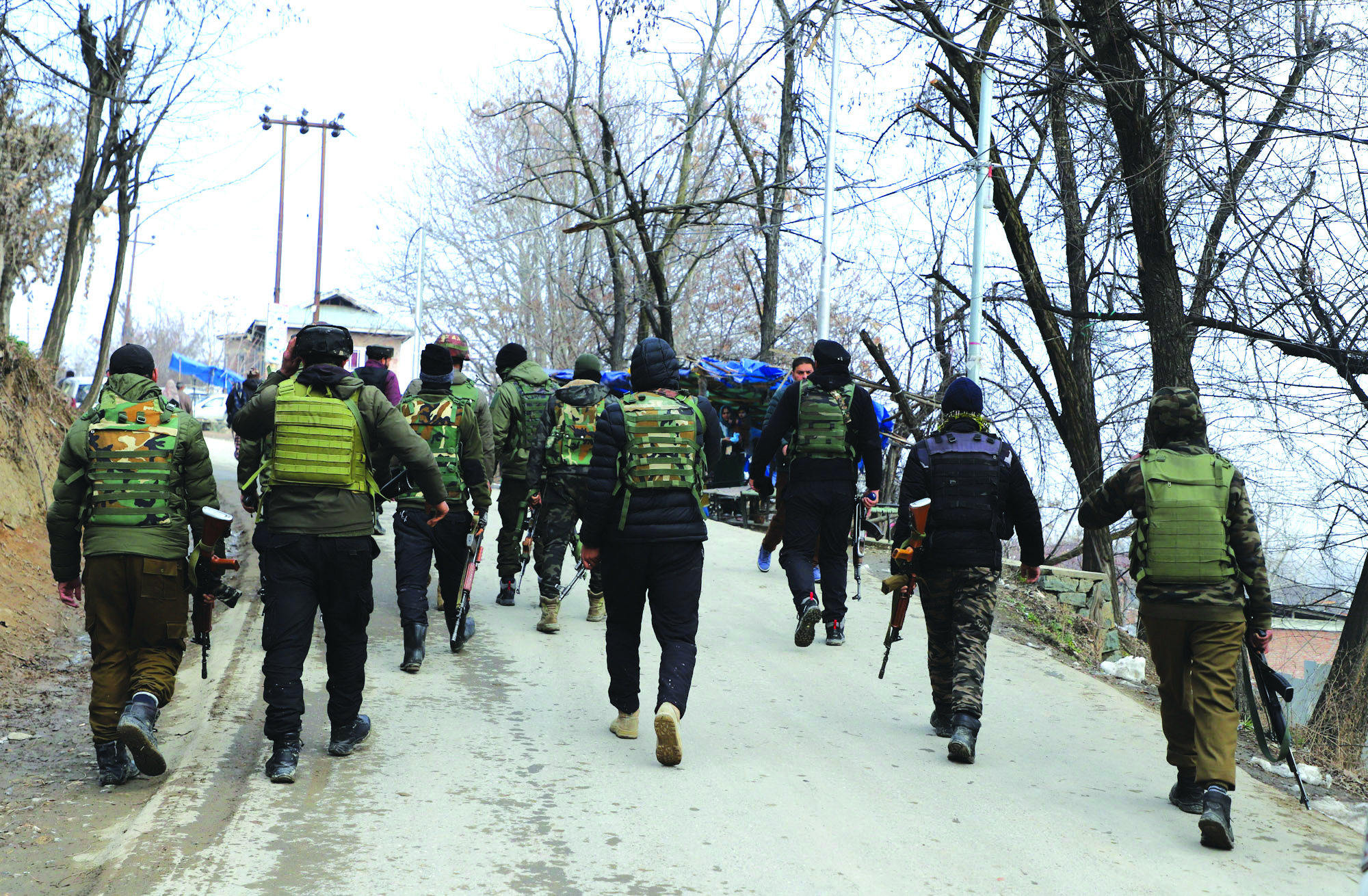 Security personnel moving towards encounter site at Budgam in Kashmir on Tuesday.